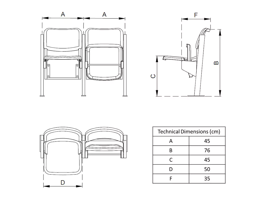This FIFA-compliant tip-up stadium chair features an automatic folding mechanism, ensuring clear aisles and enhanced crowd safety. Made from fire-retardant, UV-resistant, and impact-resistant materials, it provides long-lasting performance for football stadiums, arenas, and multi-purpose venues.
